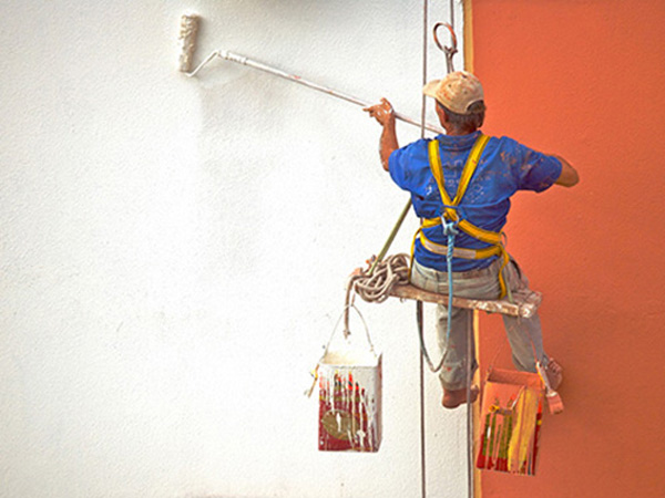 Hanging Painter painting wall with roller